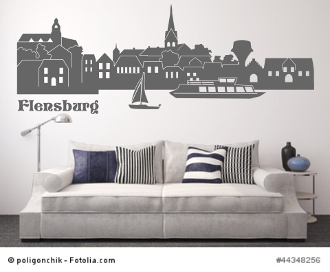 Wandtattoo Flensburg Skyline mit dem Blick auf West und Ostufer, und den wichtigsten Sehenswürdigkeiten der Stadt.
