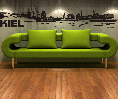 Wandtattoo Kiel Skyline zeigt die Hafenstadt mit den berühmsten Bauwerken und der Sicht auf Ostseekanal.